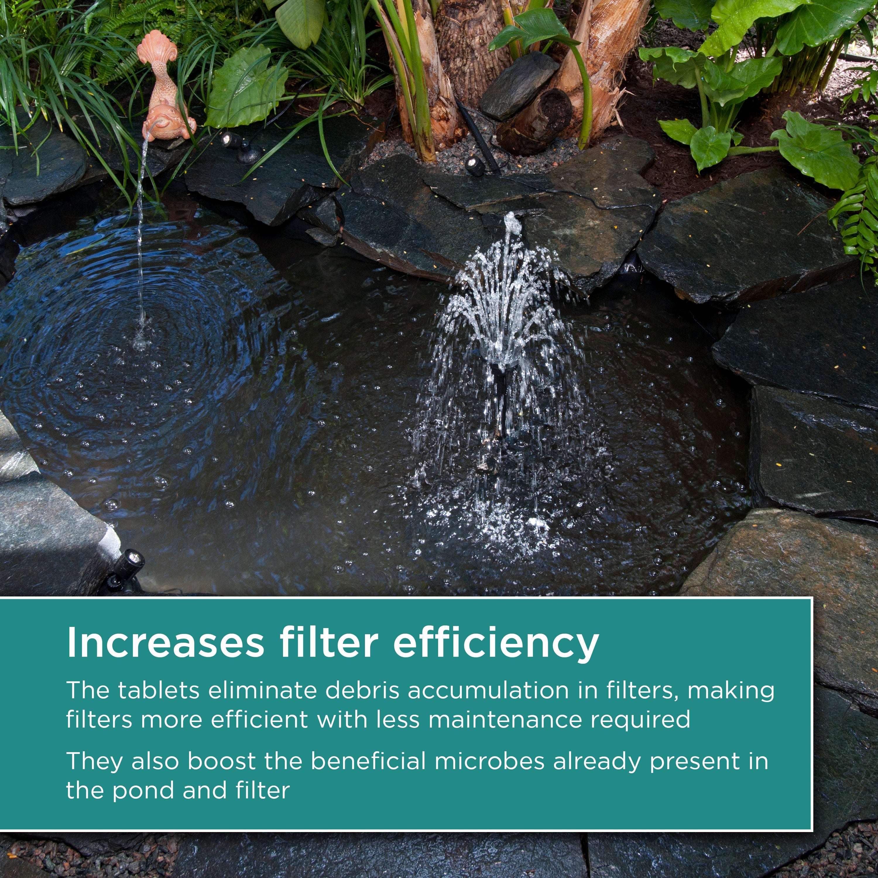 - Increases filter efficiency: The tablets eliminate debris accumulation in filters, making filters more efficient with less maintenance required. They also boost the beneficial microbes already present in the pond and filter. Â