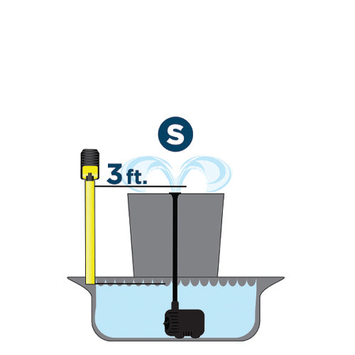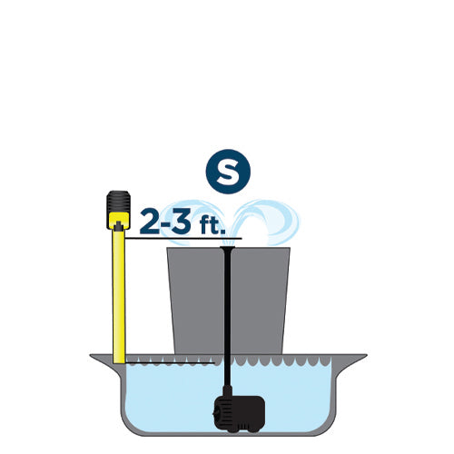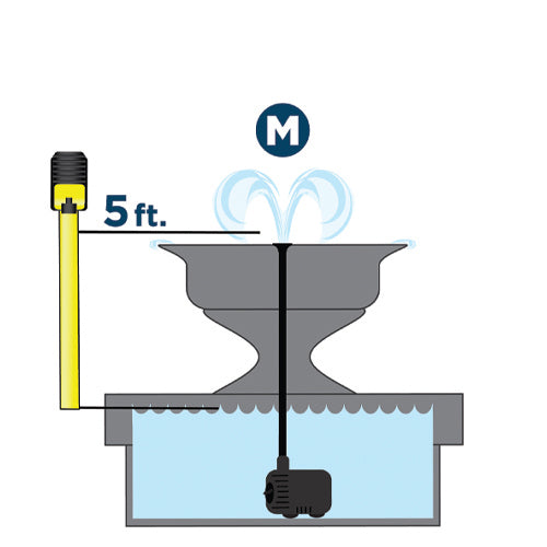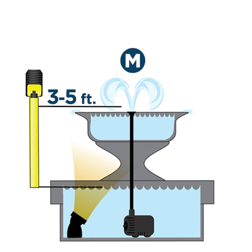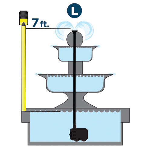 To select the right fountain pump, measure from the water level to the highest point that the water reaches. This is what we call the Ideal Pumping Height. Choose a pump using the graphics above that has an ideal pumping height greater than the height measured.