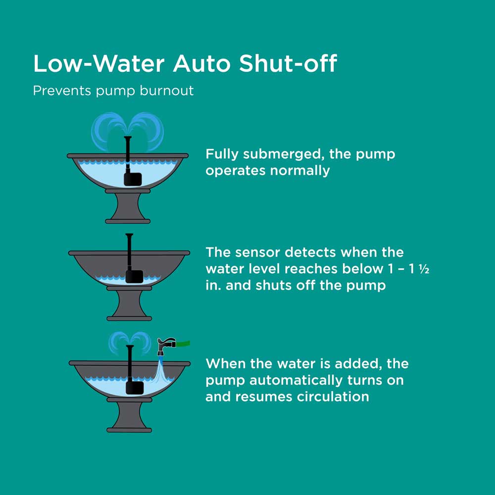 Low Water Shut-off Pumps work the same as standard submersible fountain pumps when they are fully submerged in water. However, when the water levels reach below 1-1.5 inches, a Low Water Shut-off Fountain Pump will shut itself off to prevent burnout. The pump automatically turns back on when the water levels are restored. These pumps are ideal for fountains located in a sunny or windy area where the water levels can drop unexpectedly. Â