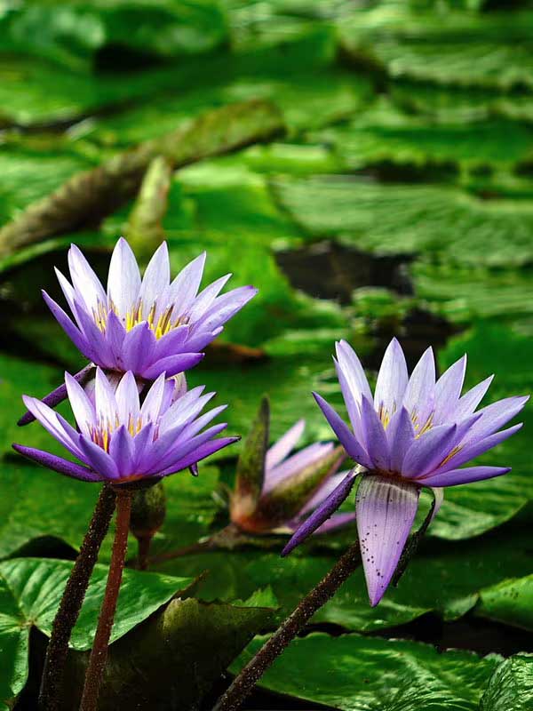 Floating plants like hyacinths independently float on the surface with their roots drifting below. These plants act as natural filters.