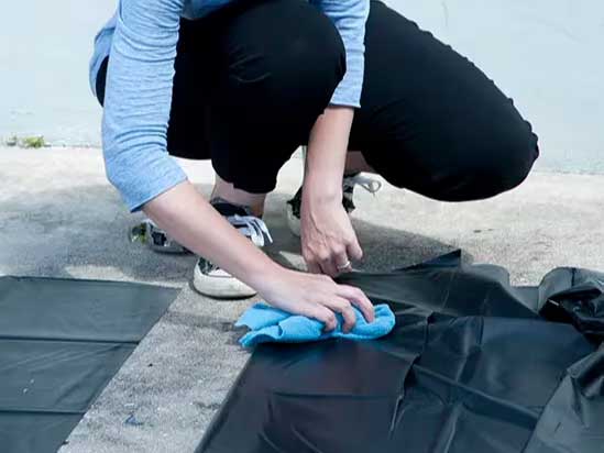Clean all areas of the liner that will overlap with a mild cleaning agent, like soapy water. For extremely dirty or sticky liners, you can use acetone. Also smooth out any wrinkles in the liners.