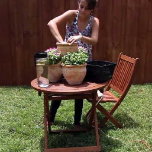Submerge the pump in water. Also, take this time to give your plants a drink. Plug it in and enjoy!